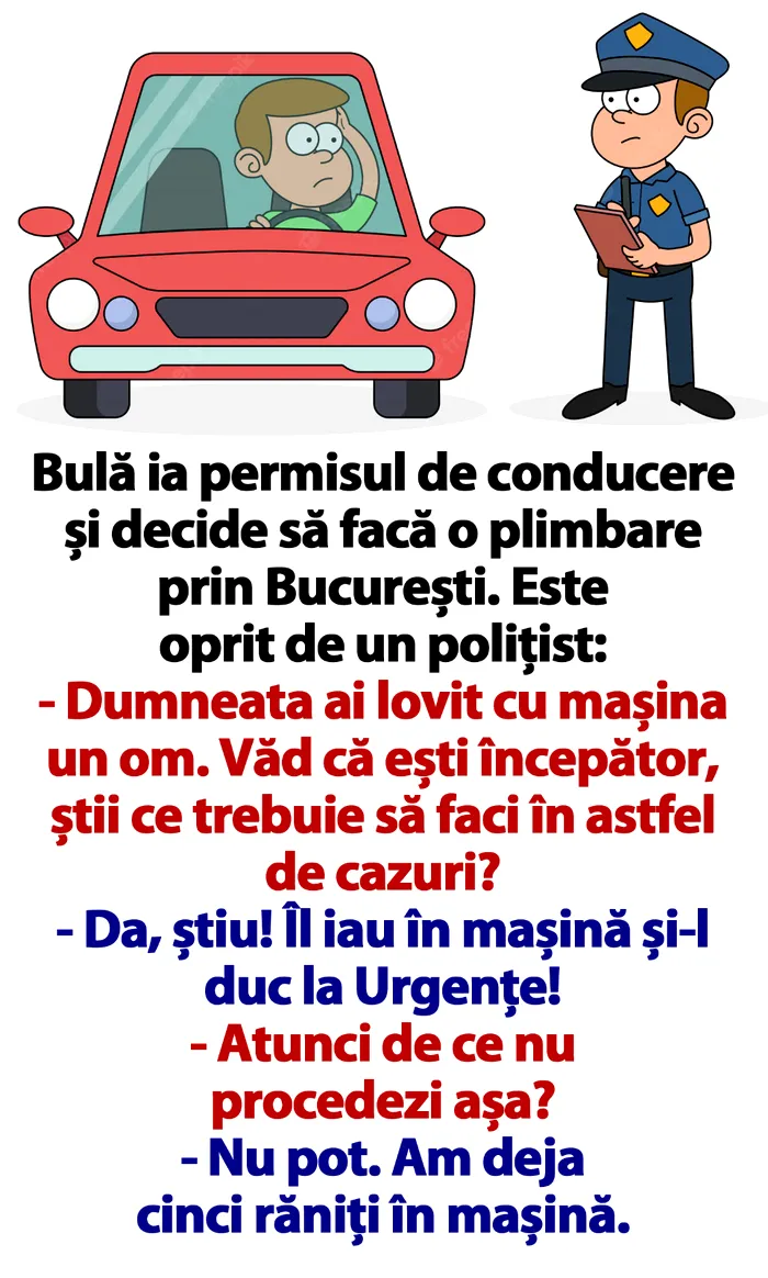 – Dumneata ai lovit cu mașina un om. Văd că ești începător, știi ce trebuie să faci în astfel de cazuri?