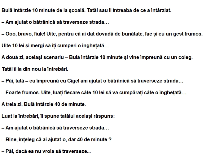 – Păi, tată – eu împreună cu Gigel am ajutat o bătrânică să traverseze strada…