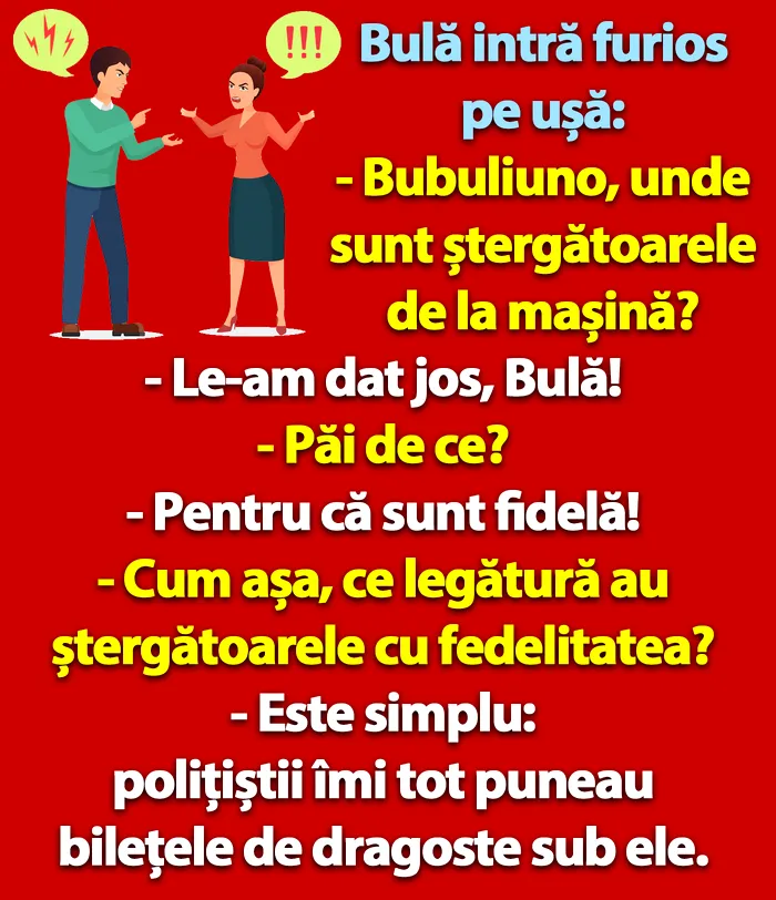 Bancul zilei cu Bulă și Bubulina. De data aceasta, cuplul se confruntă cu o problemă mai puțin obișnuită, legată de mașina personală.