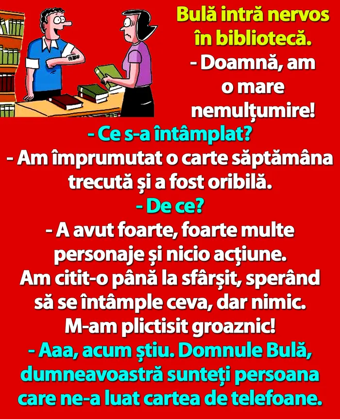 – Aaa, acum știu. Domnule Bulă, dumneavoastră sunteți persoana care ne-a luat cartea de telefoane”.