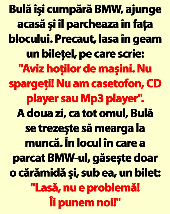 Bulă își cumpără BMW, ajunge acasă și îl parchează în fața blocului. Precaut, lasă în geam un bilețel, pe care scrie: