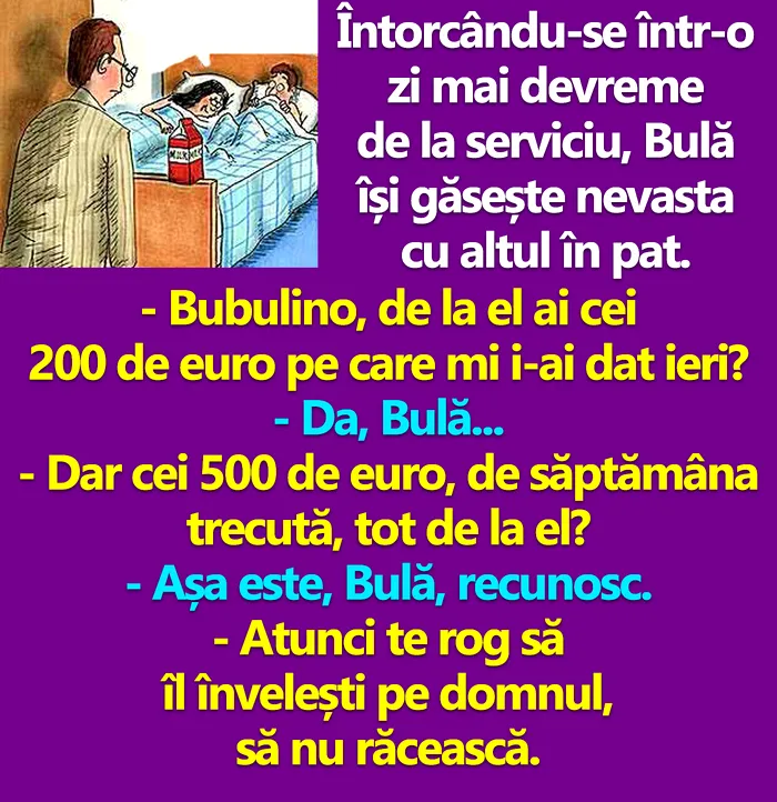Întorcându-se într-o zi mai devreme de la serviciu, Bulă își găsește nevasta cu altul în pat.