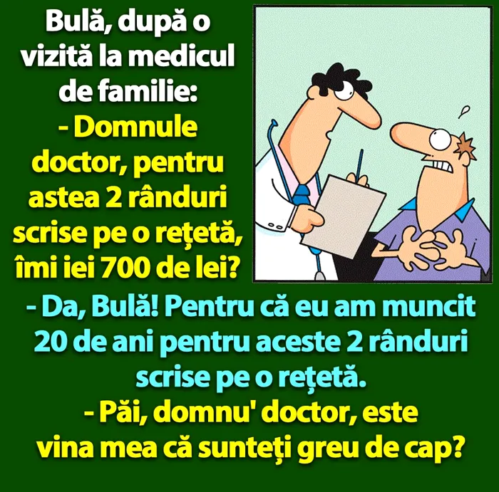 – Domnule doctor, pentru astea 2 rânduri scrise pe o rețetă, îmi iei 700 de lei?