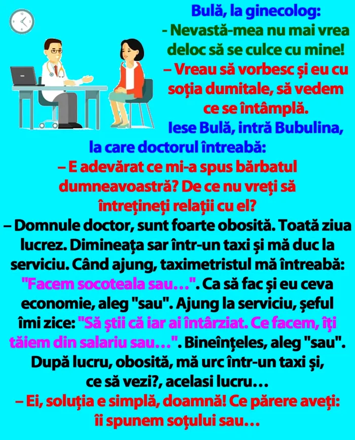 – Domnule doctor, sunt foarte obosită. Toată ziua lucrez. Dimineața sar într-un taxi și mă duc la serviciu. Când ajung, taximetristul mă întreabă: „Facem socoteala sau…”. Ca să fac și eu ceva economie, aleg „sau”. Ajung la serviciu, șeful îmi zice: „Să știi că iar ai întârziat. Ce facem, îți tăiem din salariu sau…”. Bineînțeles, aleg „sau”. După lucru, obosită, mă urc într-un taxi și, ce să vezi?, acelasi lucru…