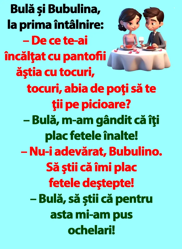 Gândul.ro vă propune și pentru această zi un banc cu Bulă și Bubulina la prima lor întâlnire.