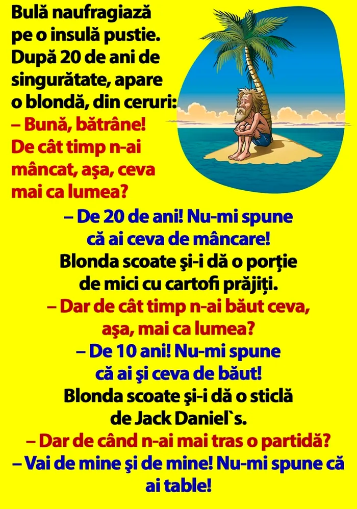 BANC | Bulă naufragiază pe o insulă pustie. După 20 de ani de singurătate, apare o blondă