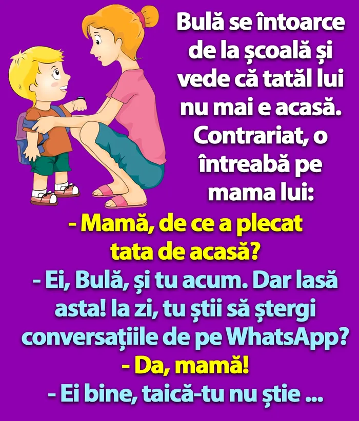 – Ei, Bulă, și tu acum. Dar… lasă asta! Ia zi, tu știi să ștergi conversațiile de pe WhatsApp?