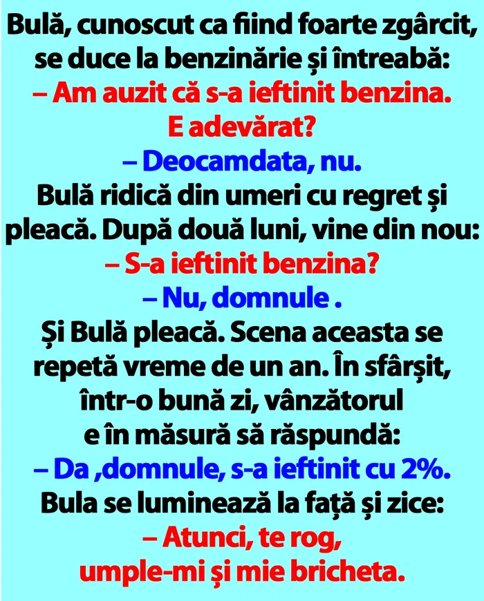 Bulă, cunoscut ca fiind foarte zgârcit, se duce la benzinărie și întreabă: