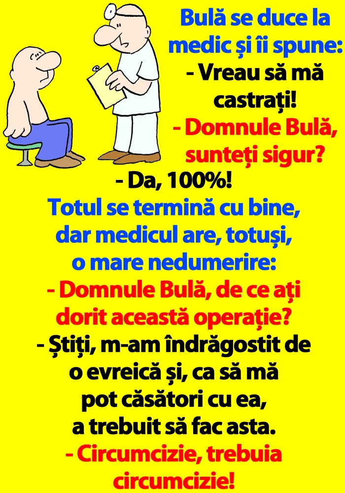 Un nou banc cu Bulă vă va face, cu siguranță, să râdeți cu poftă, mai ales când veți afla motivul pentru care a mers la medic pentru a fi castrat, deși urma să se căsătorească.
