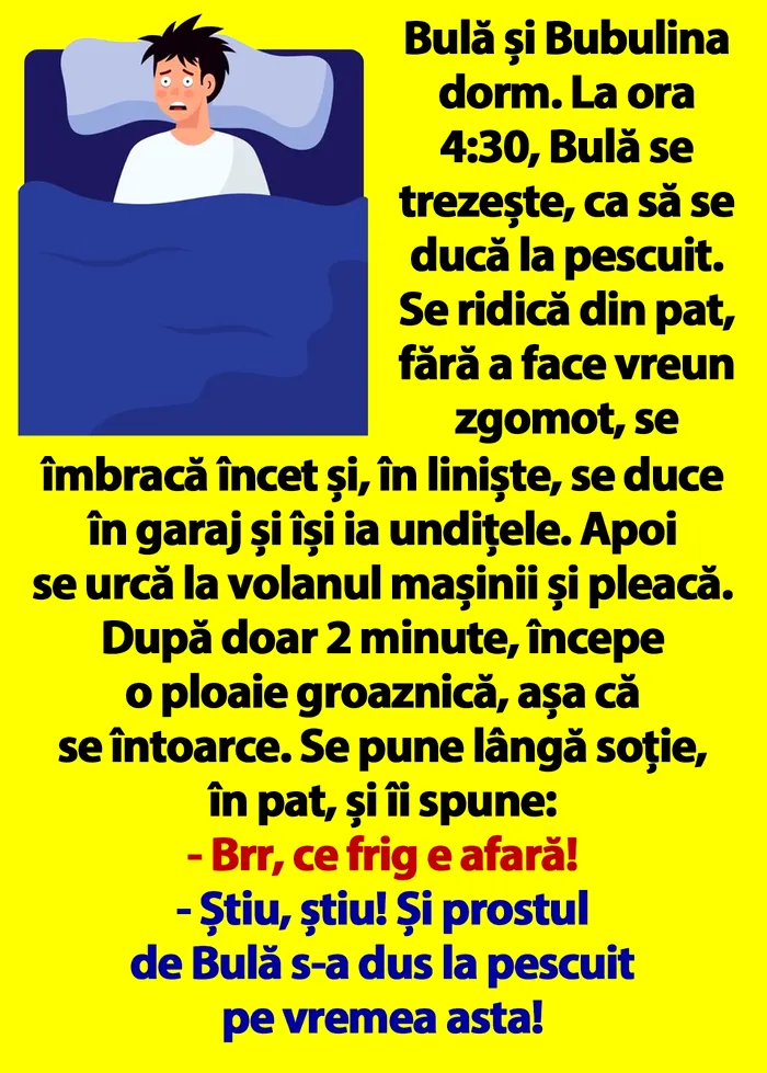 – Știu, știu! Și prostul de Bulă s-a dus la pescuit pe vremea asta!