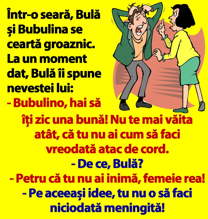 – Bubulino, hai să îți zic una bună! Nu te mai văita atât, că tu nu ai cum să faci vreodată atac de cord.