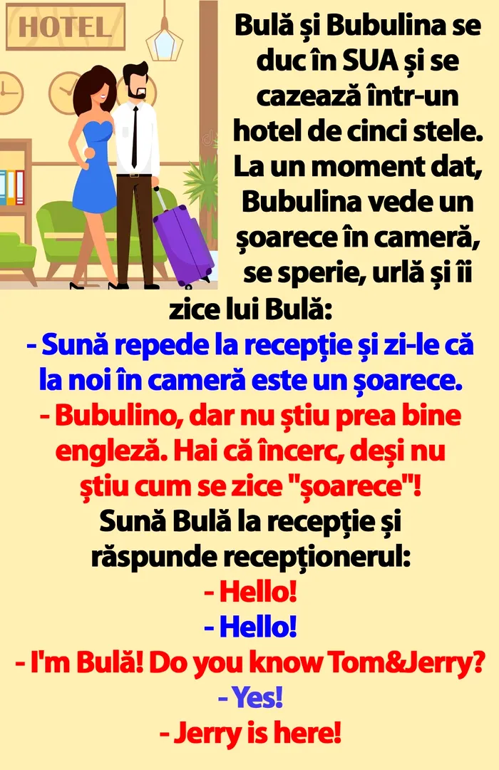 – Sună repede la recepție și zi-le că la noi în cameră este un șoarece.