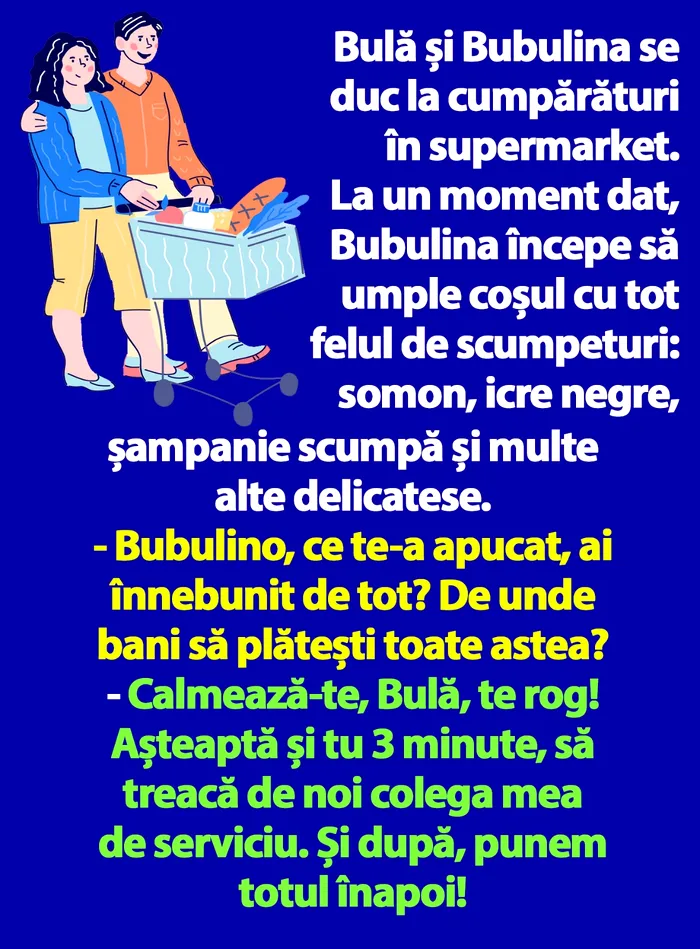 Gândul îți propune un nou banc Bulă și Bubulina. De data aceasta, ei se duc la cumpărături într-un supermarket….