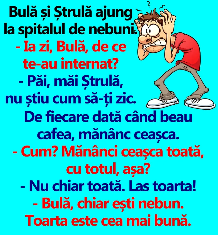 – Păi, măi Ștrulă, nu știu cum să-ți zic. De fiecare dată când beau cafea, mănânc ceașca.