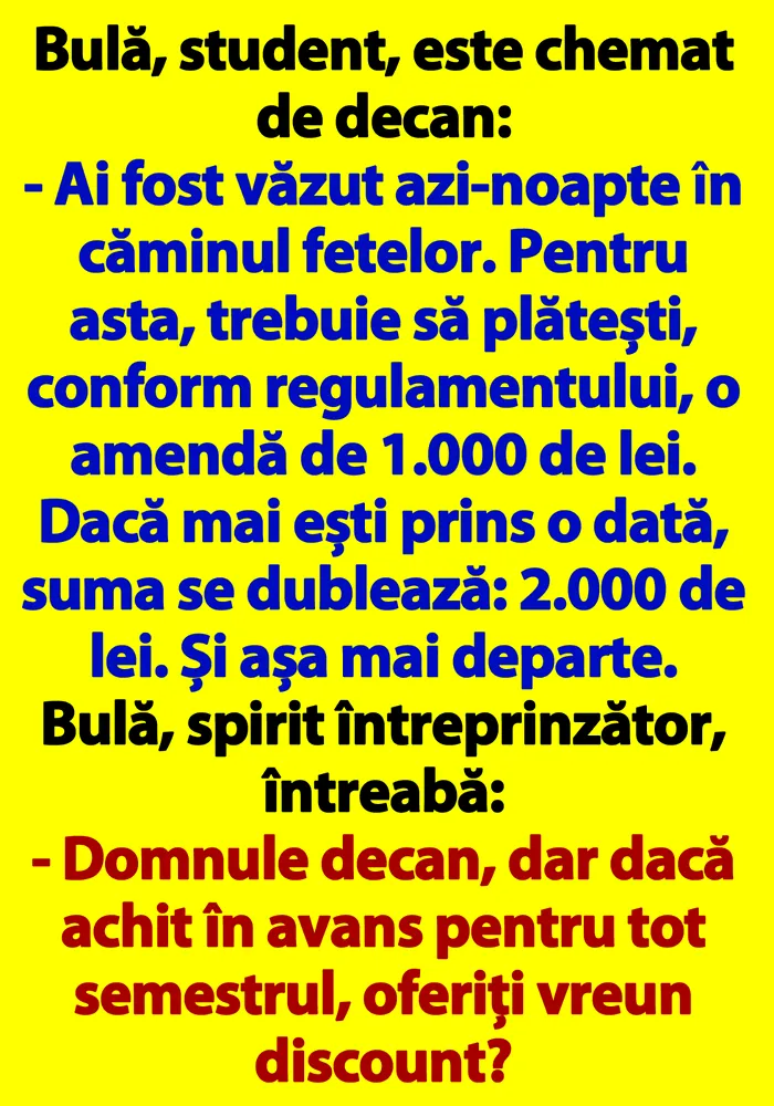 – Domnule decan, dacă achit în avans pentru tot semestrul, oferiți vreun discount?