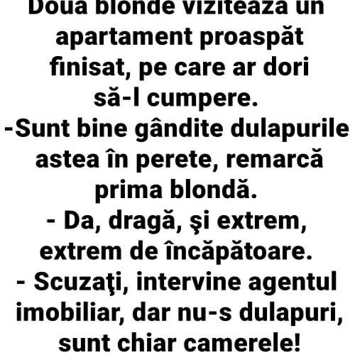 – Scuzați, intervine agentul imobiliar, dar nu-s dulapuri, sunt chiar camerele!