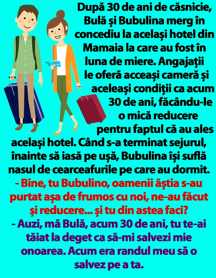 După 30 de ani de căsnicie, Bulă și Bubulina merg în concediu la același hotel din Mamaia la care au fost în luna de miere. Angajații le oferă acceași cameră și aceleași condiții ca acum 30 de ani, făcându-le o mică reducere pentru faptul că au ales același hotel. Când s-a terminat sejurul, înainte să iasă pe ușă, Bubulina își suflă nasul de cearceafurile pe care au dormit.