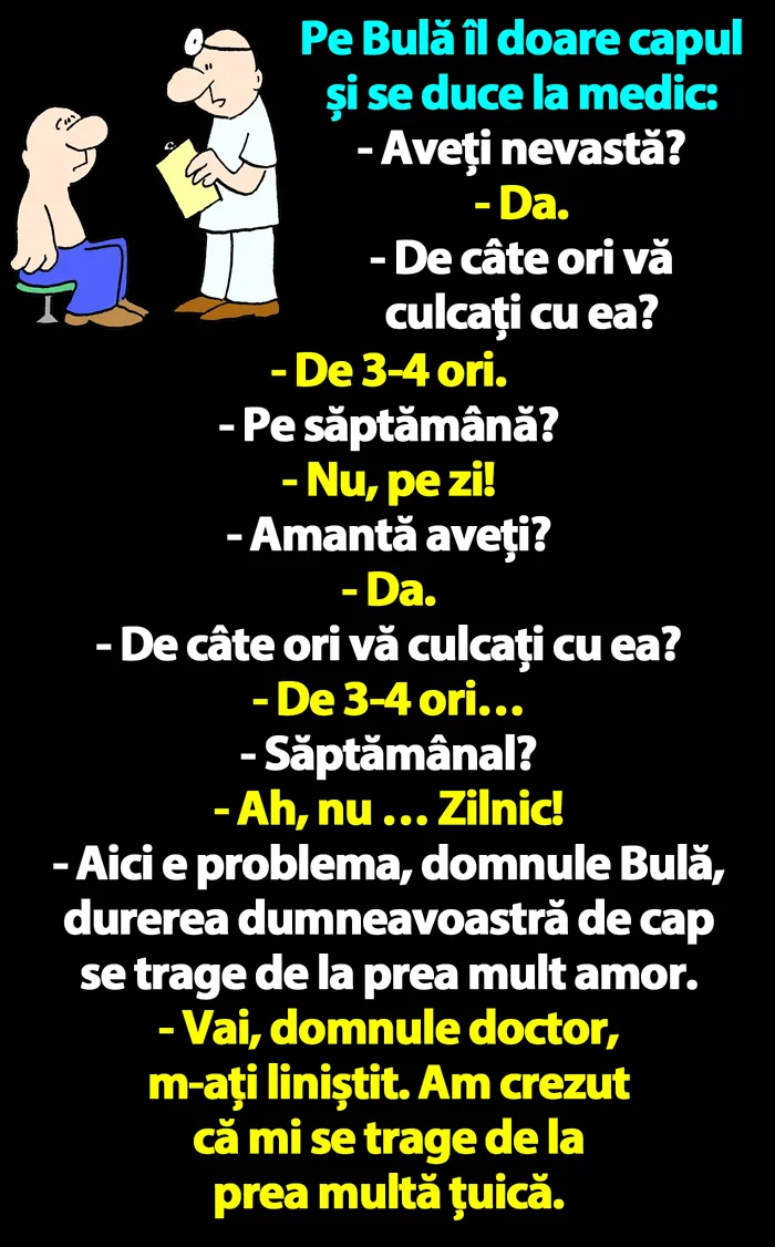 – Aici e problema, domnule Bulă, durerea dumneavoastră de cap se trage de la prea mult amor.