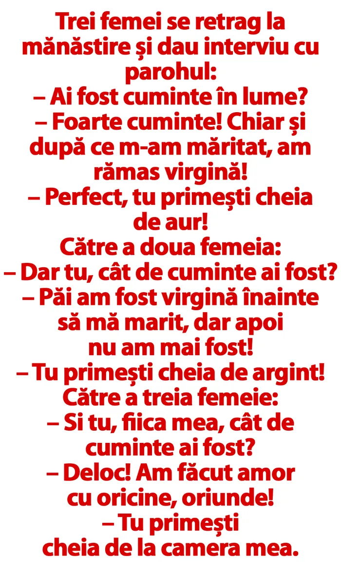 Iată bancul acestei seri, în care sunt implicate trei femei care se retrag la mănăstire și dau interviu cu parohul.