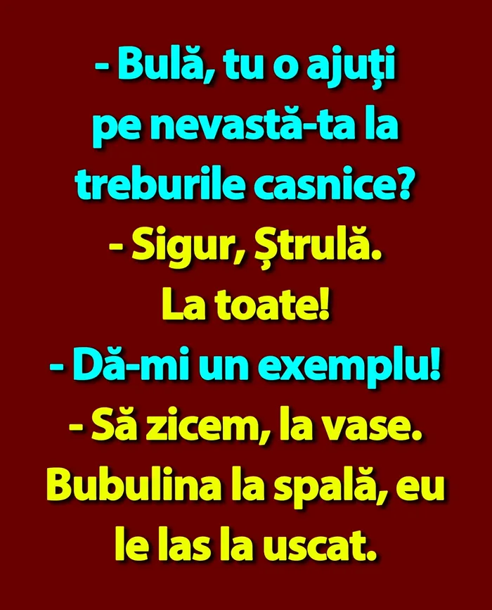 „ – Bulă, tu o ajuți pe nevastă-ta la treburile casnice?