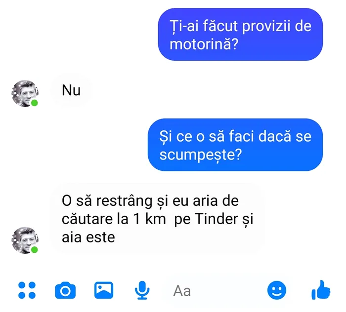 – O să restrâng și eu aria de căutare pe Tinder la 1 kilometru și aia este.