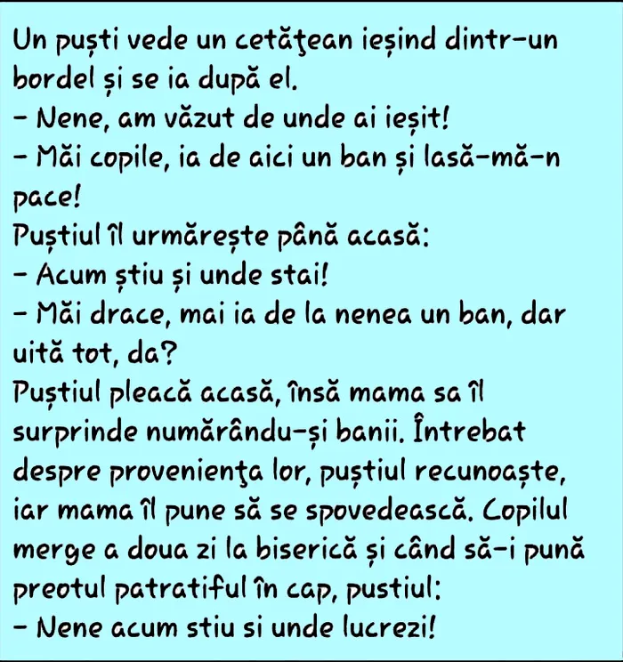 Prima pagină » Diverse » Bancul de joi | Un puști vede un bărbat ieșind dintr-un bordel și se ia după el
