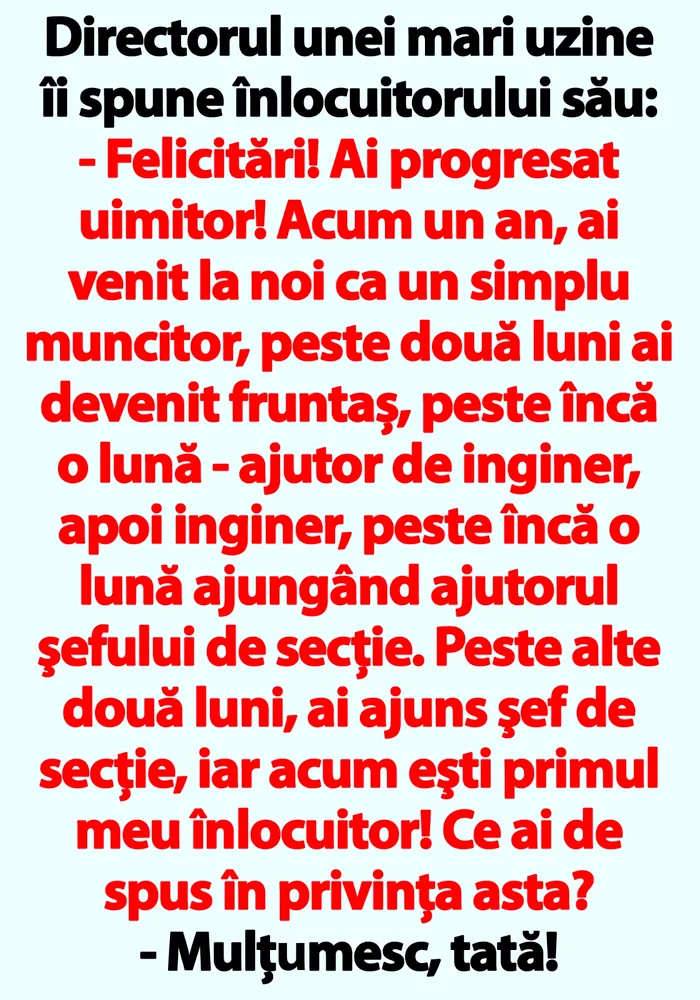 – Felicitări! Ai progresat uimitor! Acum un an, ai venit la noi ca un simplu muncitor, peste două luni ai devenit fruntaș, peste încă o lună – ajutor de inginer, apoi inginer, peste încă o lună ajungând ajutorul şefului de secţie. Peste alte două luni, ai ajuns şef de secţie, iar acum eşti primul meu înlocuitor! Ce ai de spus în privinţa asta?