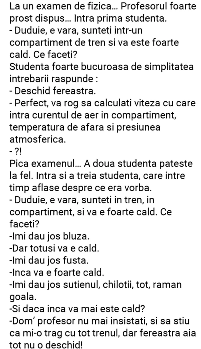 Bancul de luni | Examen de fizică: „Duduie, e vară, sunteți într-un compartiment de tren și vă este foarte cald. Ce faceți?”
