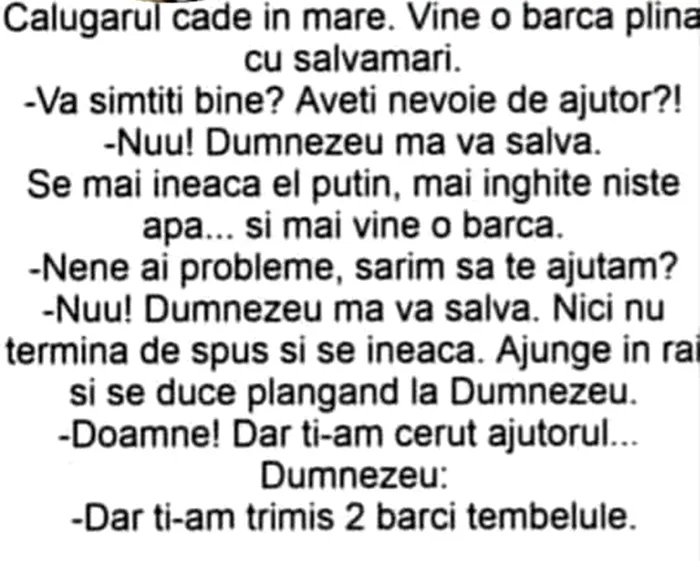 – Nuu! Dumnezeu mă va salva. Nici nu termină de spus și se îneacă. Ajunge în rai și se duce plângând la Dumnezeu.