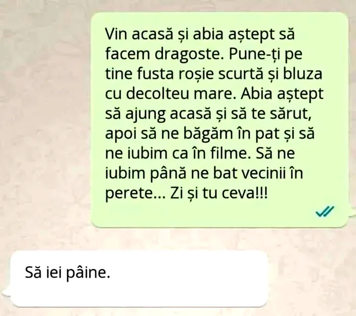 – Vin acasă și abia aștept să facem dragoste. Pune-ți pe tine fusta roșie și bluza cu decolteu mare. Abia aștept să ajung acasă și să te sărut, apoi să ne băgăm în pat și să ne iubim ca în filme. Să ne iubim până ne bat vecinii în perete…Zi și tu ceva!!
