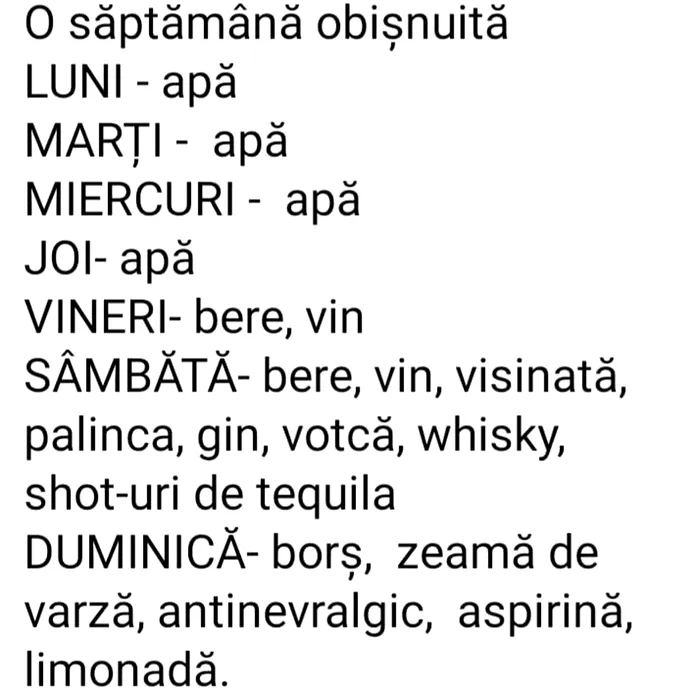 Duminică – borș, zeamă de varză, antinevralgic, aspirină, limonadă.