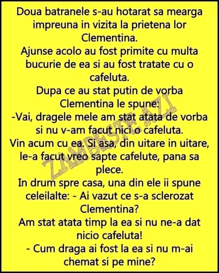 – Ai văzut ce s-a sclerozat Clementina? Am stat atâta timp la ea și nu ne-a dat nicio cafeluță!