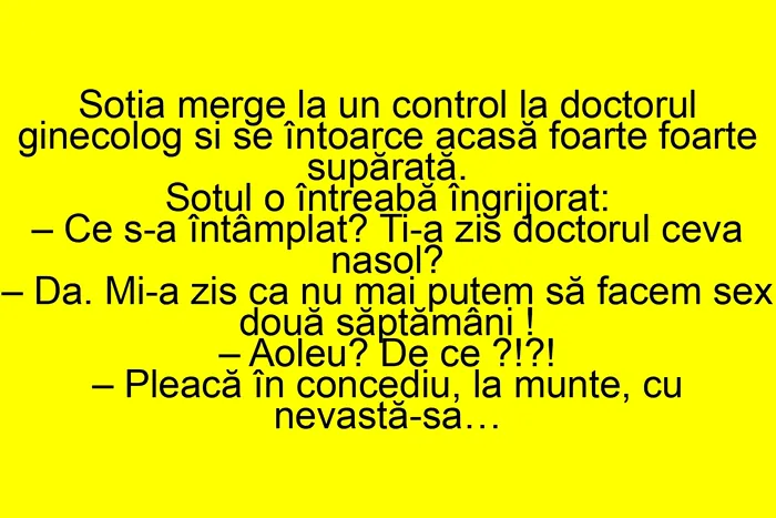 Soția merge la un control la doctorul ginecolog și se întoarce acasă foarte supărată.