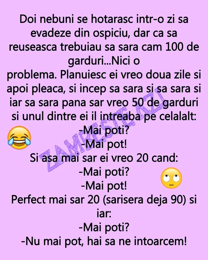 Doi nebuni se hotărăsc într-o zi să evadeze din ospiciu, dar ca să reușească trebuiau să sară cam 100 de garduri. Nici o problemă.