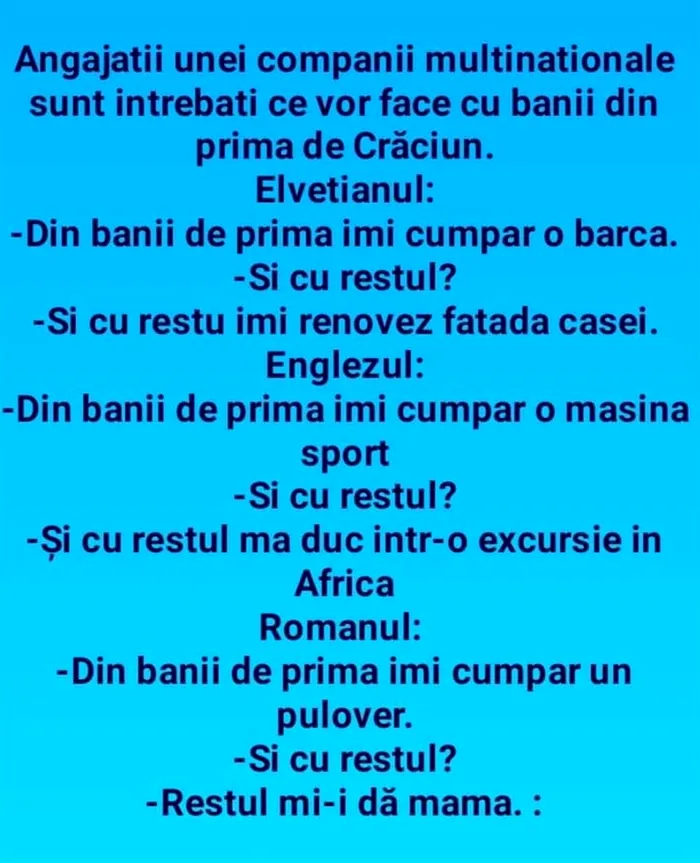 Angajații unei companii multinaționale sunt întrebați ce vor face cu banii din prima de Crăciun.