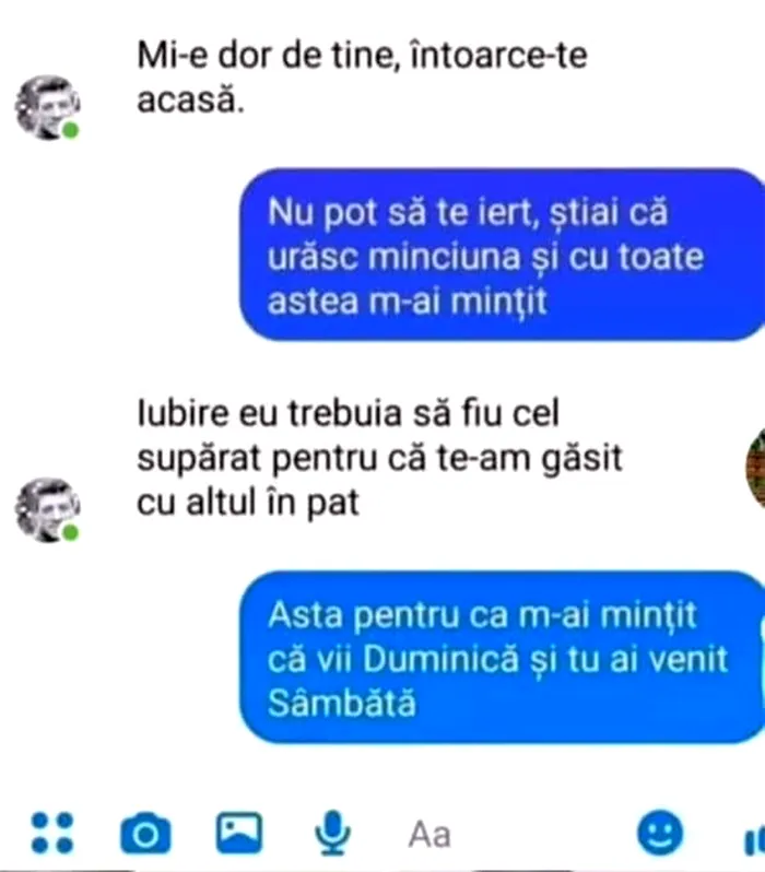 – Iubire, eu trebuia să fiu cel supărat pentru că te-am găsit cu altul în pat