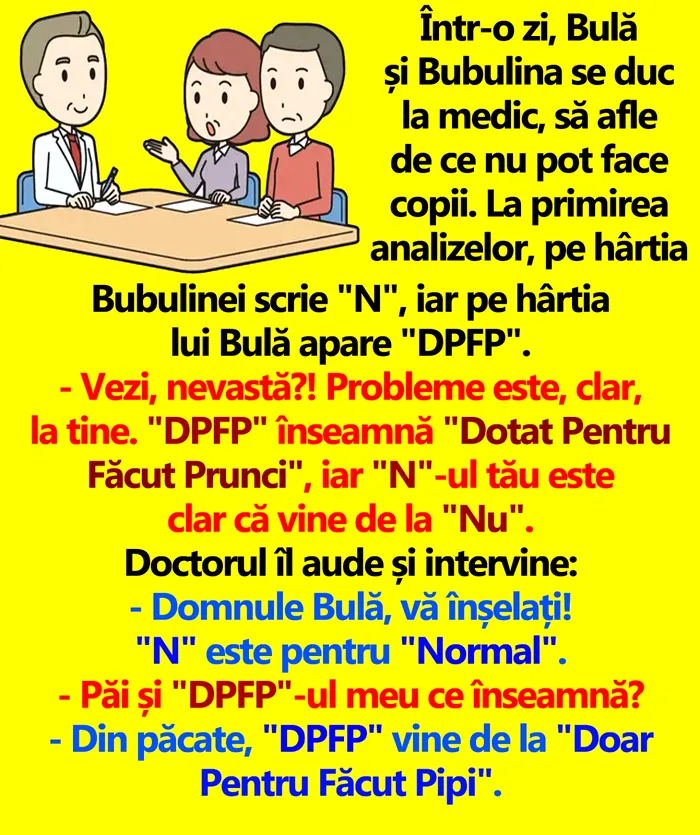 Într-o zi, Bulă și Bubulina se duc la medic, să afle de ce nu pot face copii. La primirea analizelor, pe hârtia Bubulinei scrie „N”, iar pe hârtia lui Bulă apare „DPFP”.