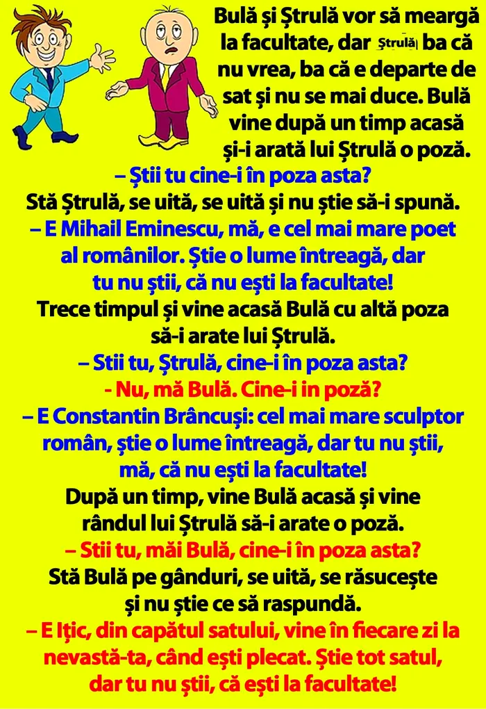 Bulă și Ștrulă vor să meargă la facultate, dar Ștrulă ba că nu vrea, ba că e departe de sat și nu se mai duce. Bulă vine după un timp acasă și-i arată lui Ștrulă o poză.