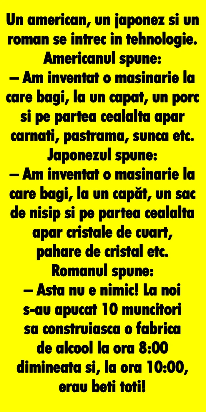 – Asta nu e nimic! La noi s-au apucat 10 muncitori să construiască o fabrică de alcool la ora 8:00 dimineața și, la ora 10:00, erau beți toți!