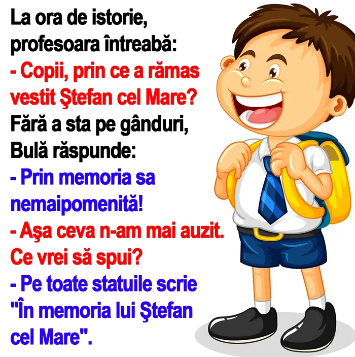 Prima pagină » Diverse » BANCUL ZILEI | Profesoara de istorie: „Bulă, prin ce a rămas vestit Ștefan cel Mare?”