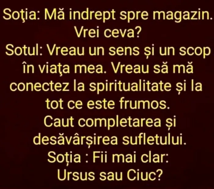 De când nu ai mai râs cu gura până la urechi? Bancul următor nu va lăsa să treacă această zi fără să te amuzi copios. Soția își sună soțul: „Mă îndrept spre magazin, vrei ceva?”. Găsești continuarea în rândurile de mai jos.