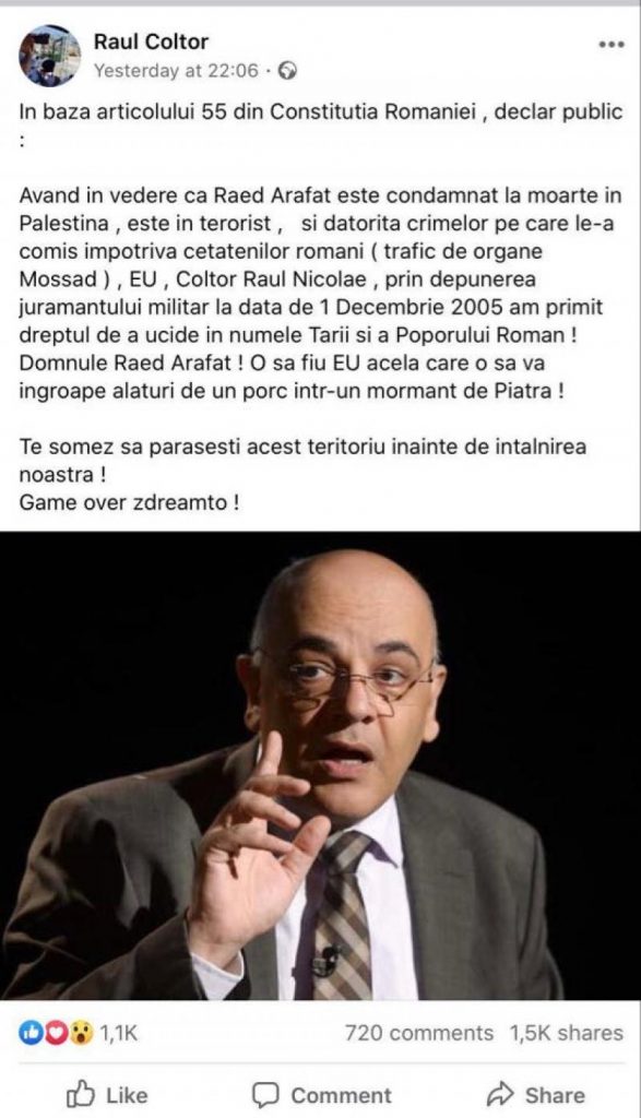 Un adept al teoriei conspiraţiei l-a acuzat pe Raed Arafat ca ar fi „condamnat la moarte în Palestina” și că ar fi comis „crime împotriva cetățenilor români” . Mesajul de amenințare a fost transmis pe pagina de FB al șefului DSU, anunță Digi24.