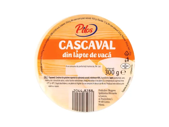 Cașcavalul din lapte de vacă Pilos are un gramaj de 300 grame și o declarație nutrițională după cum urmează (la 100 grame): Valoare energetică: 1288 kJ/310 kcal, Grăsimi: 23,0g, din care acizi grași saturați: 16,0 grame, Glucide: 1,7 grame, din care zaharuri: 0,2 grame, Proteine: 24,0 grame, Sare: 1,70 grame.