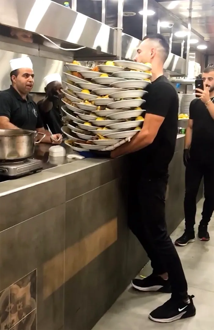 El a cărat 31 de farfurii pline cu mâncare spre mesele clienților, fără a scăpa vreuna. Fiecare farfurie cântărește câte 2 kg, în total 62 kg. Ospătarul le-a putut transporta cu mare atenție și control la mesele clienților.