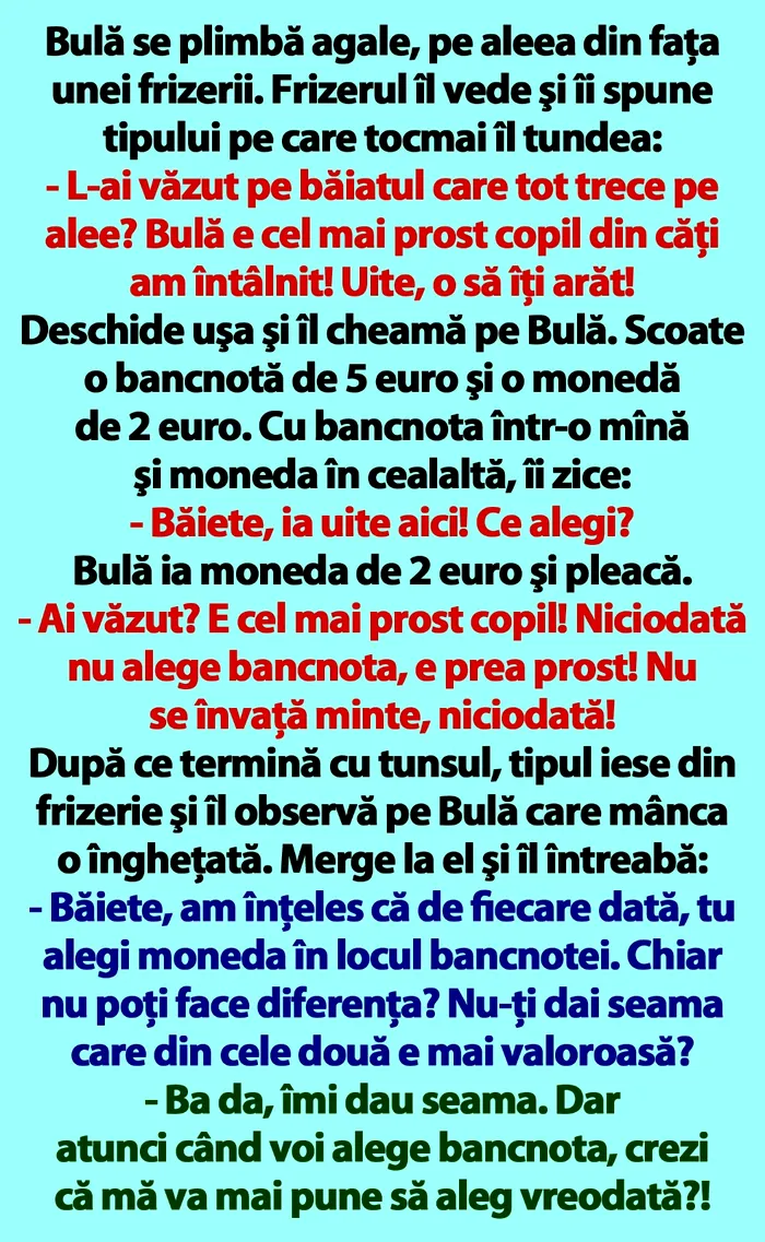 – Băiete, am înţeles că de fiecare dată, tu alegi moneda în locul bancnotei. Chiar nu poţi face diferenţa? Nu-ţi dai seama care din cele două e mai valoroasă?