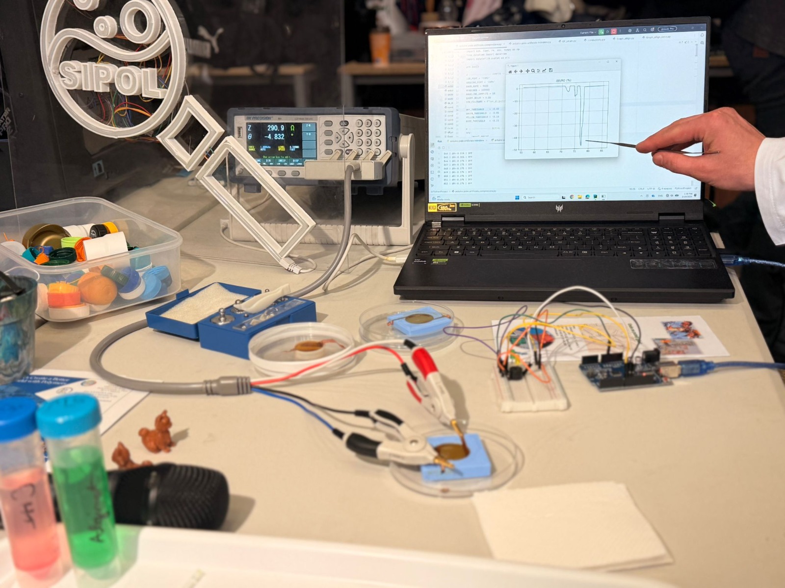 Exact în această logică a fost gândit și setup-ul demonstrativ prezentat de Cosmin Pauliuc la Poli ChemistryFEST, unde o presiune ușoară activa un LED verde, una moderată aprindea un LED galben, iar depășirea unui prag critic declanșa un buzzer.