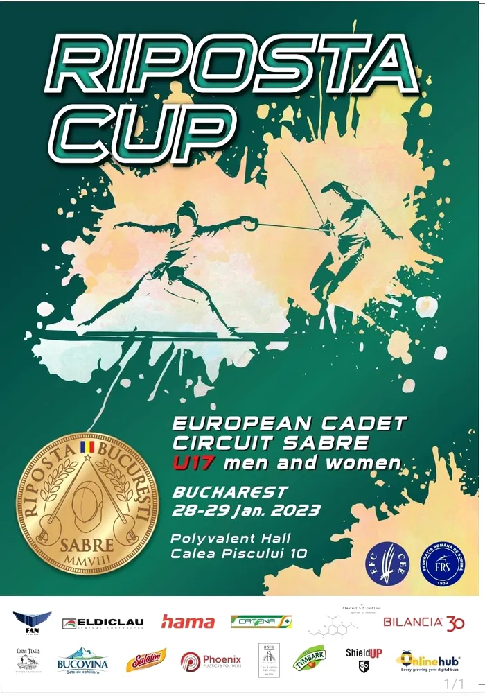 În perioada 28 – 29 ianuarie 2023 va avea loc la București Cupa Riposta, la sabie feminin și masculin. Competiția face parte din Circuitul European de Cadeți și contează pentru calificarea sportivilor la Campionatele Europene și Mondiale de Cadeți 2023. Întrecerile debutează zilnic la ora 09:00, iar semifinalele sunt programate la ora 18:00.
