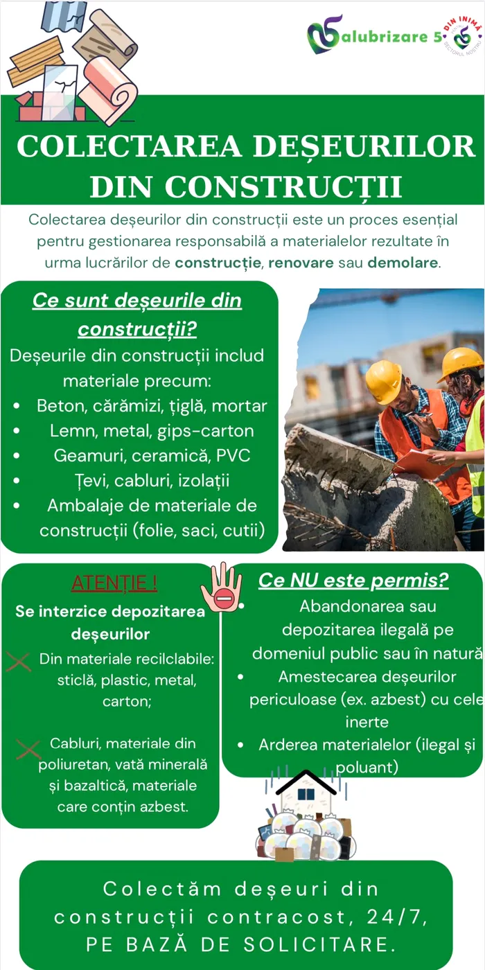 „Colectăm deșeuri din construcții contracost, 27/7, PE BAZĂ DE SOLICITARE. Contactează-ne! salubrizare5.ro / 031 9450”, transmit reprezentanții Salubrizare Sector 5.