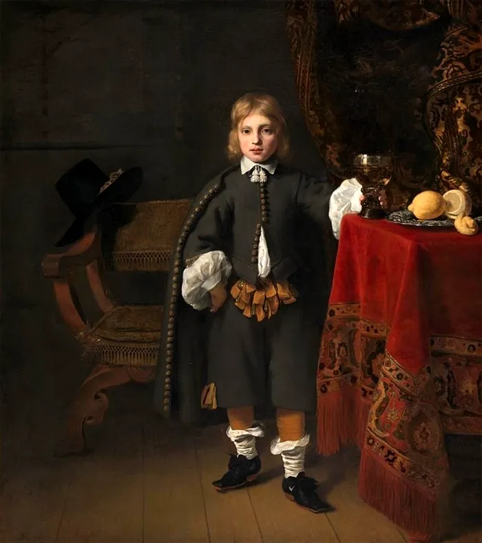 Galeria detaliază: „Băiatul este îmbrăcat elegant într-un costum gri și pelerina asortată, împodobită cu nasturi aurii strălucitori și fundițe din panglică; pălăria lui cu boruri largi este agățată de spătarul unui scaun în spatele lui”.