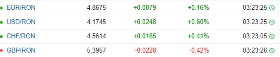 Astfel, 1 euro este cotat la 4.8675, la fel ca și cota înregistrată miercuri când a atins a aceeași valoare. De precizat că până la ora 13.00, valoarea lui se poate modifica. Dolarul, în schimb, se află într-o relativă creștere față de ziua de marți. Miercuri, moneda americană are o valoare de 4.1745 față de 4.1619 înregistrată pe data de 3 noiembrie. În fine, lira sterlină a scăzut față de ziua de marți și a ajuns la 5.3957, față de 5.4047, valoarea pe care a avut-o pe 3 noiembrie.
